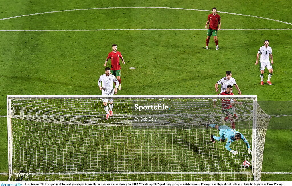 1 September 2021; Republic of Ireland goalkeeper Gavin Bazunu makes a save during the FIFA World Cup 2022 qualifying group A match between Portugal and Republic of Ireland at Estádio Algarve in Faro, Portugal. Photo by Seb Daly/Sportsfile