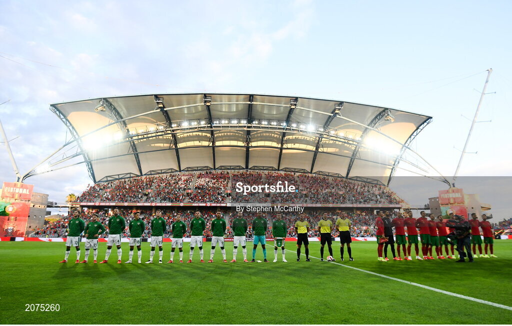 1 September 2021; Players of both sides and officials before the FIFA World Cup 2022 qualifying group A match between Portugal and Republic of Ireland at Estádio Algarve in Faro, Portugal. Photo by Stephen McCarthy/Sportsfile