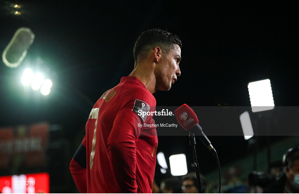 1 September 2021; Cristiano Ronaldo of Portugal is interviewed by the media after his side's victory in the FIFA World Cup 2022 qualifying group A match between Portugal and Republic of Ireland at Estádio Algarve in Faro, Portugal. Photo by Stephen McCarthy/Sportsfile