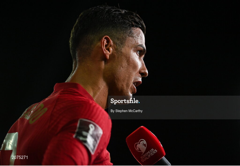 1 September 2021; Cristiano Ronaldo of Portugal is interviewed by the media after his side's victory in the FIFA World Cup 2022 qualifying group A match between Portugal and Republic of Ireland at Estádio Algarve in Faro, Portugal. Photo by Stephen McCarthy/Sportsfile