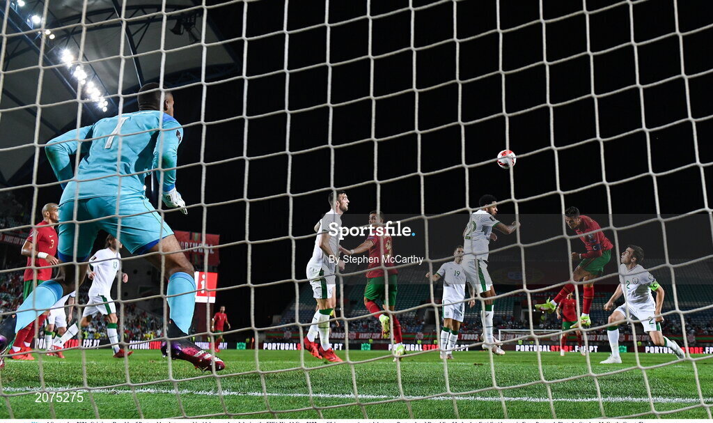 1 September 2021; Cristiano Ronaldo of Portugal heads to score his side's second goal during the FIFA World Cup 2022 qualifying group A match between Portugal and Republic of Ireland at Estádio Algarve in Faro, Portugal. Photo by Stephen McCarthy/Sportsfile