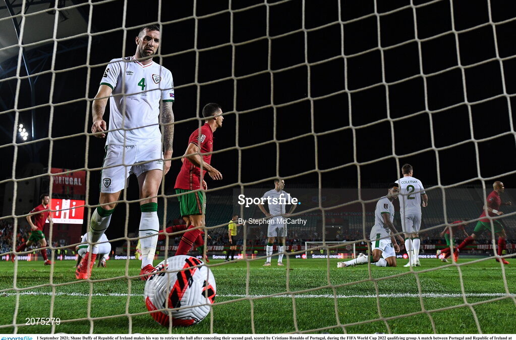 1 September 2021; Shane Duffy of Republic of Ireland makes his way to retrieve the ball after conceding their second goal, scored by Cristiano Ronaldo of Portugal, during the FIFA World Cup 2022 qualifying group A match between Portugal and Republic of Ireland at Estádio Algarve in Faro, Portugal. Photo by Stephen McCarthy/Sportsfile