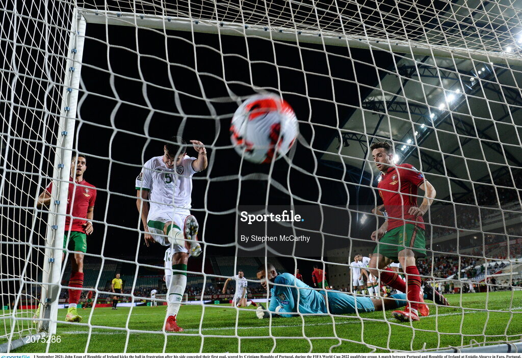 1 September 2021; John Egan of Republic of Ireland kicks the ball in frustration after his side conceded their first goal, scored by Cristiano Ronaldo of Portugal, during the FIFA World Cup 2022 qualifying group A match between Portugal and Republic of Ireland at Estádio Algarve in Faro, Portugal. Photo by Stephen McCarthy/Sportsfile