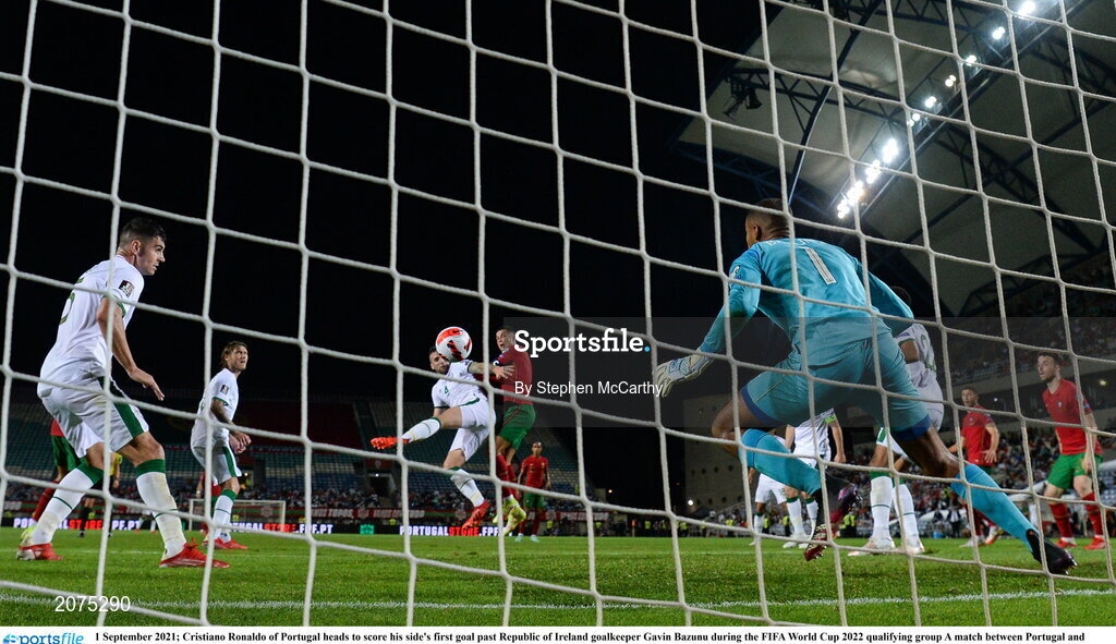 1 September 2021; Cristiano Ronaldo of Portugal heads to score his side's first goal past Republic of Ireland goalkeeper Gavin Bazunu during the FIFA World Cup 2022 qualifying group A match between Portugal and Republic of Ireland at Estádio Algarve in Faro, Portugal. Photo by Stephen McCarthy/Sportsfile