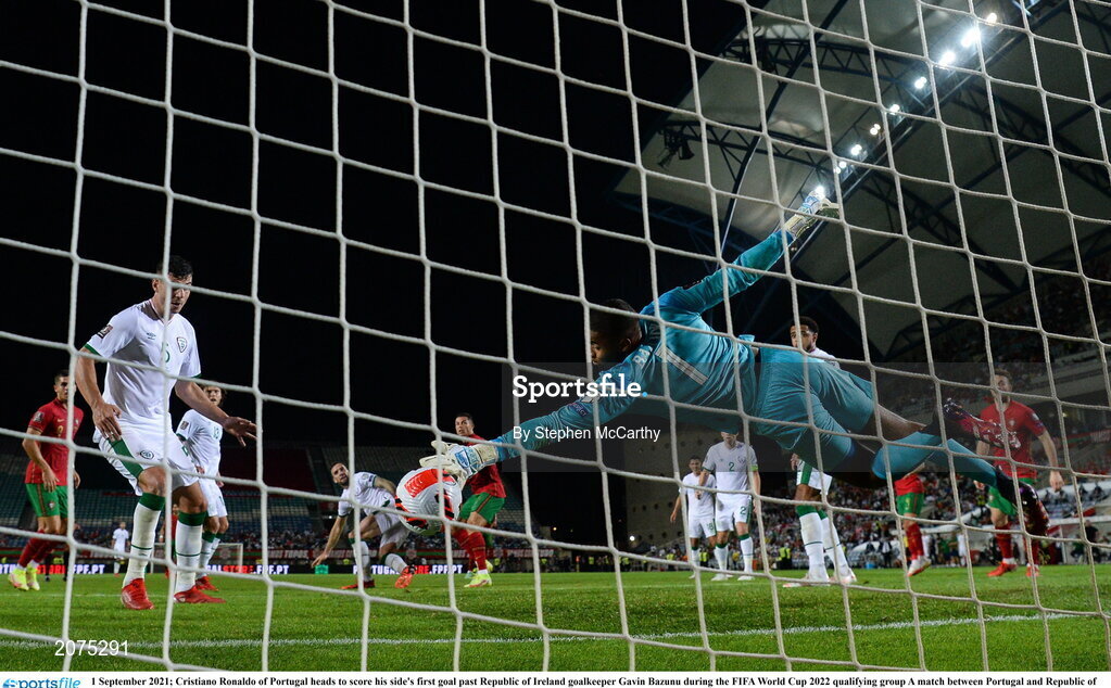 1 September 2021; Cristiano Ronaldo of Portugal heads to score his side's first goal past Republic of Ireland goalkeeper Gavin Bazunu during the FIFA World Cup 2022 qualifying group A match between Portugal and Republic of Ireland at Estádio Algarve in Faro, Portugal. Photo by Stephen McCarthy/Sportsfile