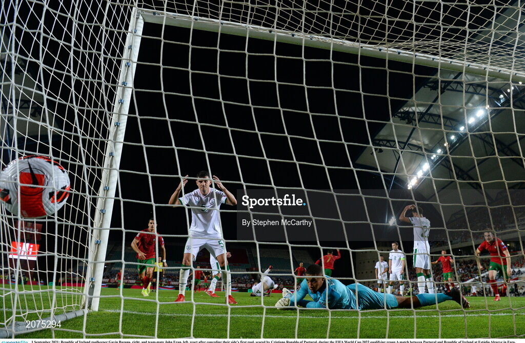 1 September 2021; Republic of Ireland goalkeeper Gavin Bazunu, right, and team-mate John Egan, left, react after conceding their side's first goal, scored by Cristiano Ronaldo of Portugal, during the FIFA World Cup 2022 qualifying group A match between Portugal and Republic of Ireland at Estádio Algarve in Faro, Portugal. Photo by Stephen McCarthy/Sportsfile