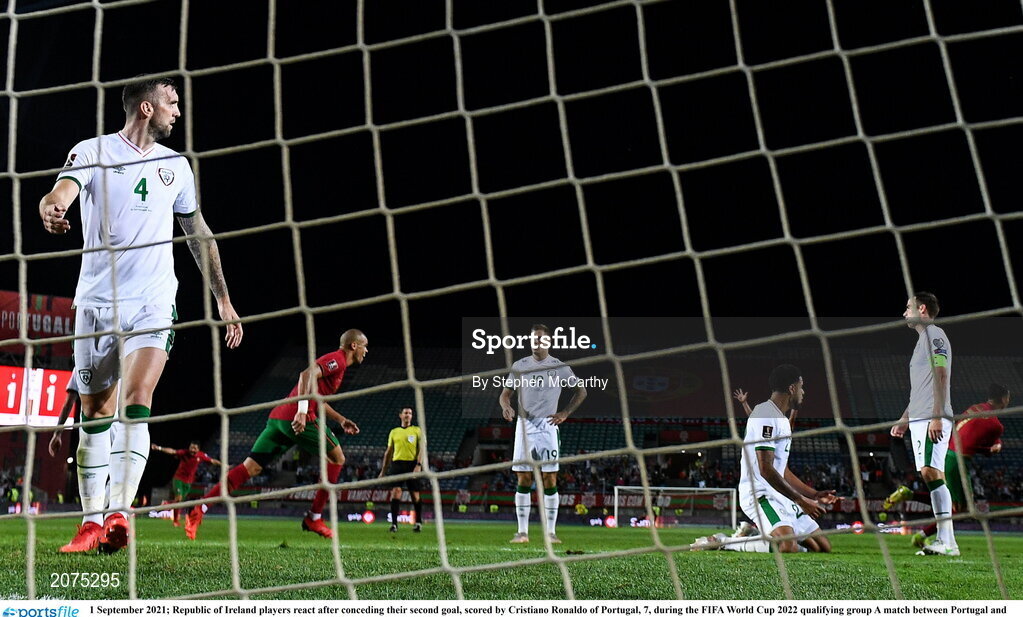 1 September 2021; Republic of Ireland players react after conceding their second goal, scored by Cristiano Ronaldo of Portugal, 7, during the FIFA World Cup 2022 qualifying group A match between Portugal and Republic of Ireland at Estádio Algarve in Faro, Portugal. Photo by Stephen McCarthy/Sportsfile