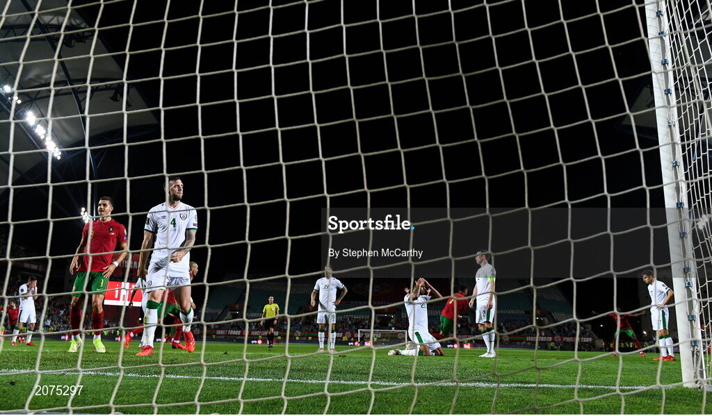 1 September 2021; Republic of Ireland players react after conceding their second goal, scored by Cristiano Ronaldo of Portugal, 7, during the FIFA World Cup 2022 qualifying group A match between Portugal and Republic of Ireland at Estádio Algarve in Faro, Portugal. Photo by Stephen McCarthy/Sportsfile