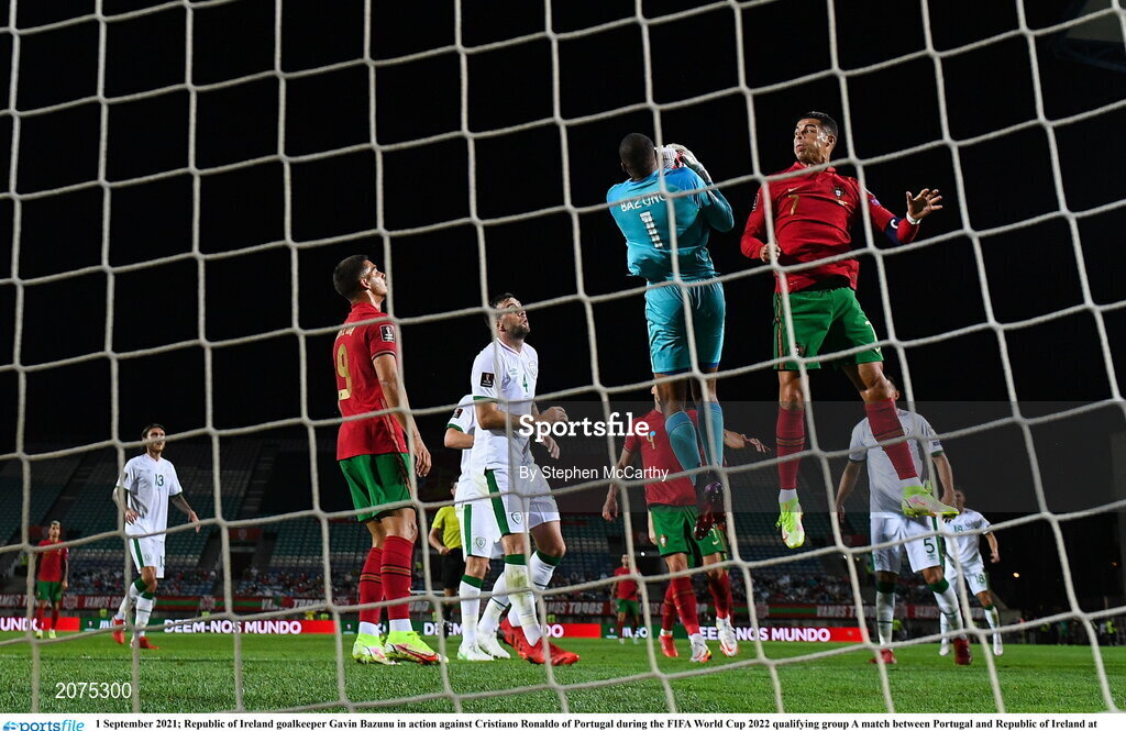 1 September 2021; Republic of Ireland goalkeeper Gavin Bazunu in action against Cristiano Ronaldo of Portugal during the FIFA World Cup 2022 qualifying group A match between Portugal and Republic of Ireland at Estádio Algarve in Faro, Portugal. Photo by Stephen McCarthy/Sportsfile