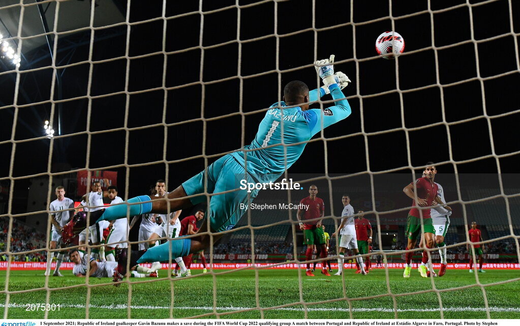 1 September 2021; Republic of Ireland goalkeeper Gavin Bazunu makes a save during the FIFA World Cup 2022 qualifying group A match between Portugal and Republic of Ireland at Estádio Algarve in Faro, Portugal. Photo by Stephen McCarthy/Sportsfile