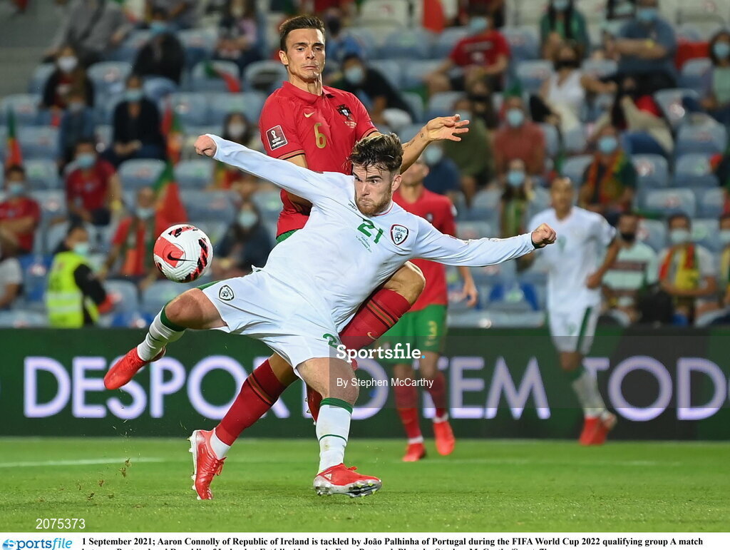 1 September 2021; Aaron Connolly of Republic of Ireland is tackled by João Palhinha of Portugal during the FIFA World Cup 2022 qualifying group A match between Portugal and Republic of Ireland at Estádio Algarve in Faro, Portugal. Photo by Stephen McCarthy/Sportsfile