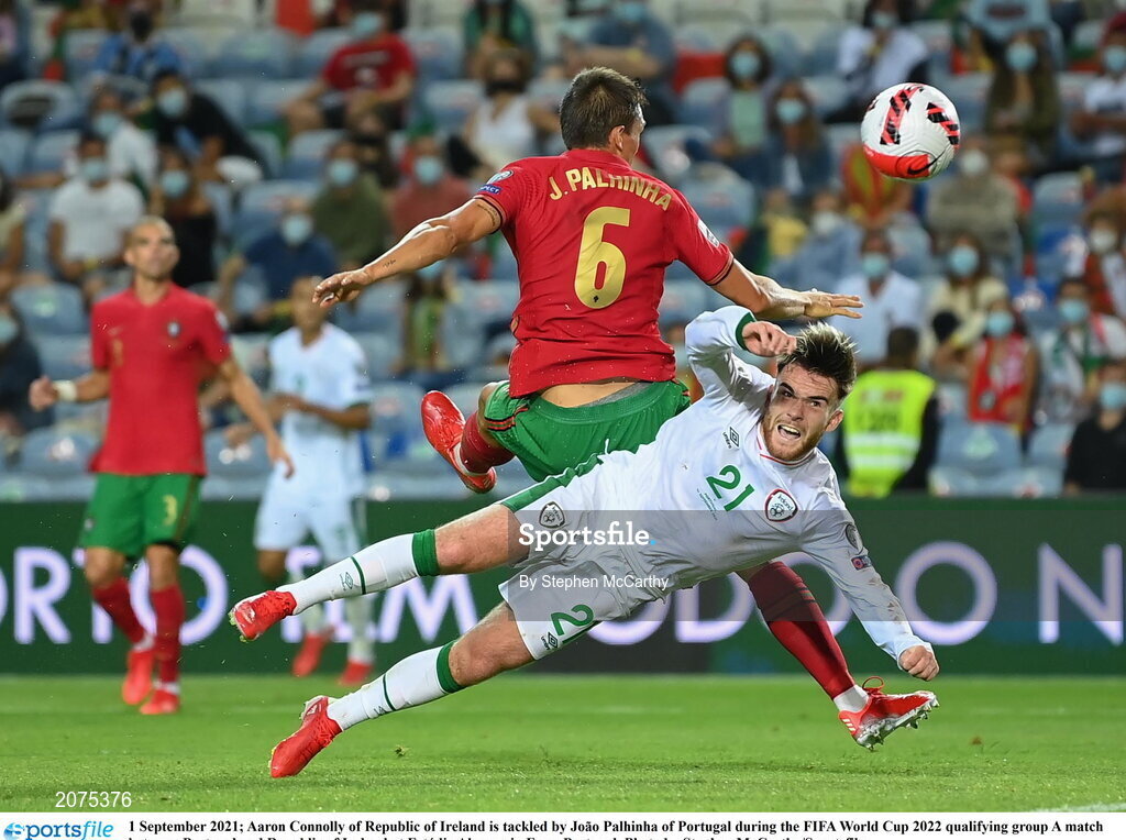 1 September 2021; Aaron Connolly of Republic of Ireland is tackled by João Palhinha of Portugal during the FIFA World Cup 2022 qualifying group A match between Portugal and Republic of Ireland at Estádio Algarve in Faro, Portugal. Photo by Stephen McCarthy/Sportsfile