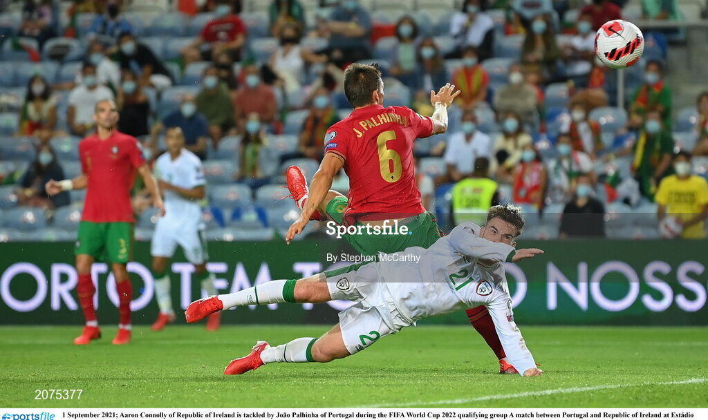 1 September 2021; Aaron Connolly of Republic of Ireland is tackled by João Palhinha of Portugal during the FIFA World Cup 2022 qualifying group A match between Portugal and Republic of Ireland at Estádio Algarve in Faro, Portugal. Photo by Stephen McCarthy/Sportsfile