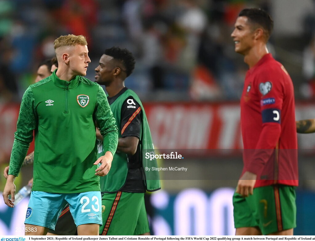 1 September 2021; Republic of Ireland goalkeeper James Talbot and Cristiano Ronaldo of Portugal following the FIFA World Cup 2022 qualifying group A match between Portugal and Republic of Ireland at Estádio Algarve in Faro, Portugal. Photo by Stephen McCarthy/Sportsfile