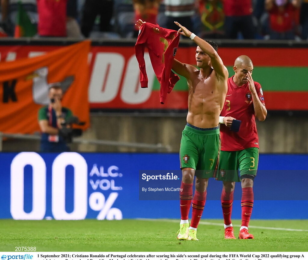 1 September 2021; Cristiano Ronaldo of Portugal celebrates after scoring his side's second goal during the FIFA World Cup 2022 qualifying group A match between Portugal and Republic of Ireland at Estádio Algarve in Faro, Portugal. Photo by Stephen McCarthy/Sportsfile