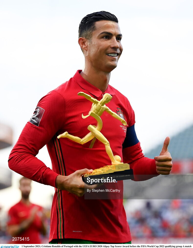 1 September 2021; Cristiano Ronaldo of Portugal with the UEFA EURO 2020 Alipay Top Scorer Award before the FIFA World Cup 2022 qualifying group A match between Portugal and Republic of Ireland at Estádio Algarve in Faro, Portugal. Photo by Stephen McCarthy/Sportsfile