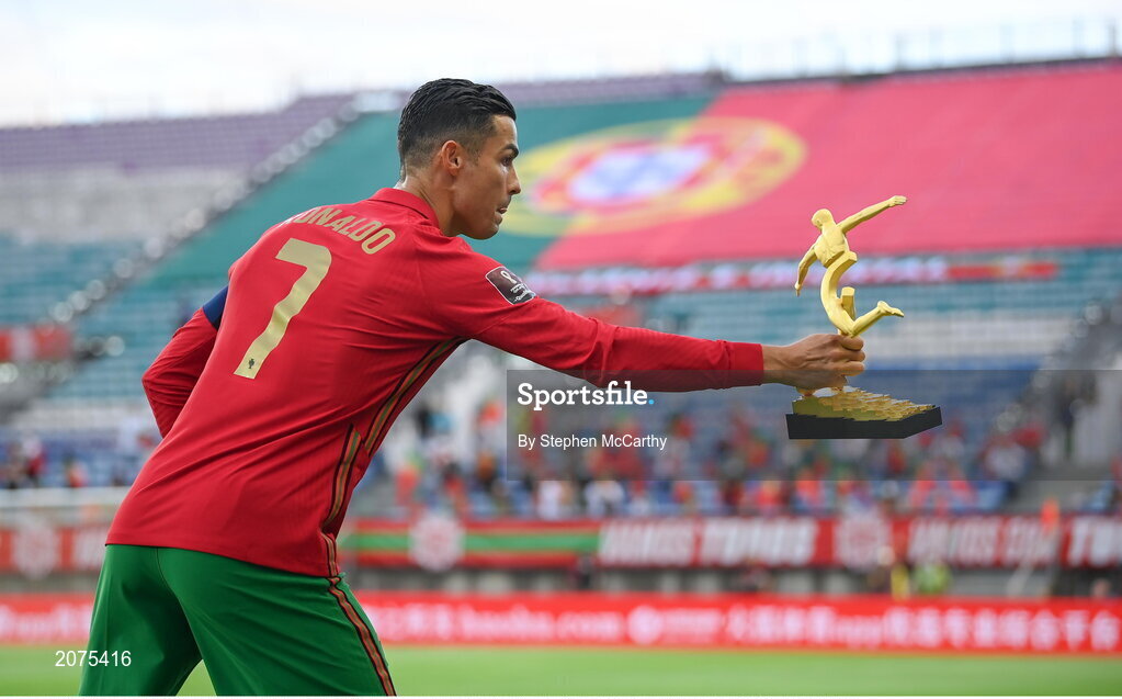 1 September 2021; Cristiano Ronaldo of Portugal with the UEFA EURO 2020 Alipay Top Scorer Award before the FIFA World Cup 2022 qualifying group A match between Portugal and Republic of Ireland at Estádio Algarve in Faro, Portugal. Photo by Stephen McCarthy/Sportsfile