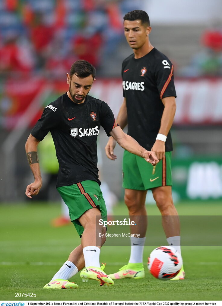1 September 2021; Bruno Fernandes and Cristiano Ronaldo of Portugal before the FIFA World Cup 2022 qualifying group A match between Portugal and Republic of Ireland at Estádio Algarve in Faro, Portugal. Photo by Stephen McCarthy/Sportsfile