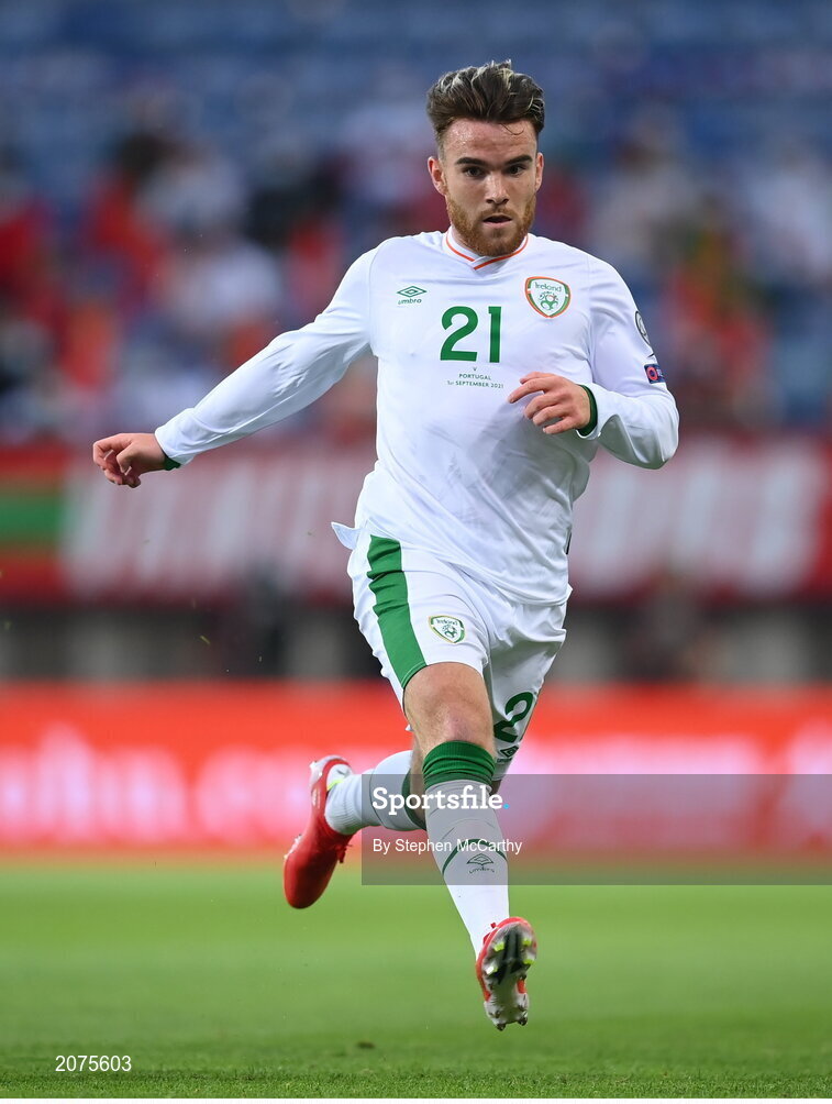 1 September 2021; Aaron Connolly of Republic of Ireland during the FIFA World Cup 2022 qualifying group A match between Portugal and Republic of Ireland at Estádio Algarve in Faro, Portugal. Photo by Stephen McCarthy/Sportsfile