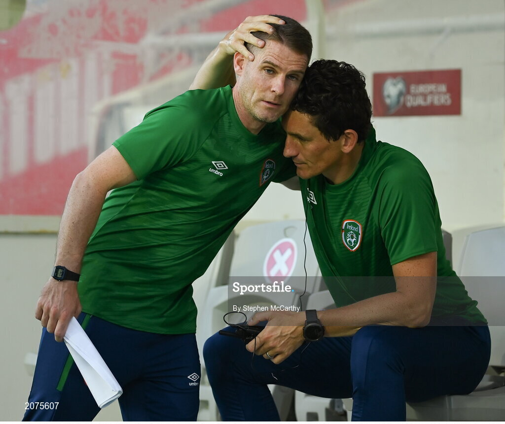 1 September 2021; Republic of Ireland coach Anthony Barry and coach Keith Andrews, right, embrace before the FIFA World Cup 2022 qualifying group A match between Portugal and Republic of Ireland at Estádio Algarve in Faro, Portugal. Photo by Stephen McCarthy/Sportsfile