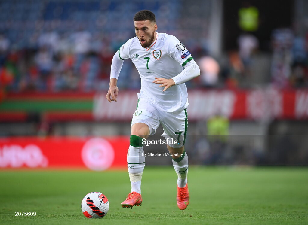1 September 2021; Matt Doherty of Republic of Ireland during the FIFA World Cup 2022 qualifying group A match between Portugal and Republic of Ireland at Estádio Algarve in Faro, Portugal. Photo by Stephen McCarthy/Sportsfile