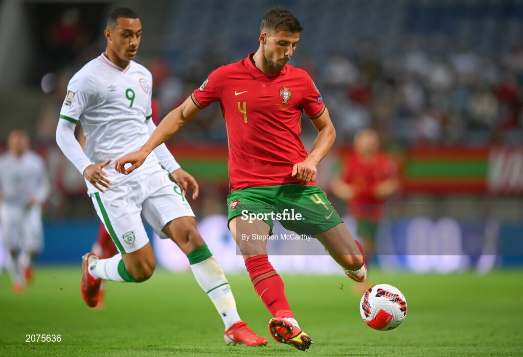 1 September 2021; Rúben Dias of Portugal in action against Adam Idah of Republic of Ireland during the FIFA World Cup 2022 qualifying group A match between Portugal and Republic of Ireland at Estádio Algarve in Faro, Portugal. Photo by Stephen McCarthy/Sportsfile