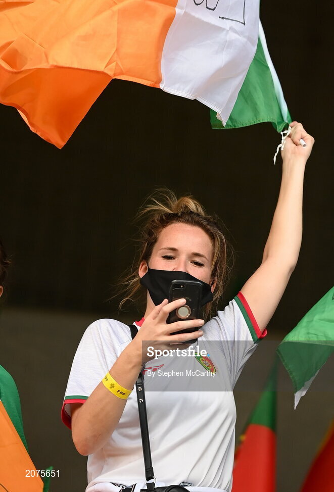 1 September 2021; A Republic of Ireland supporter before the FIFA World Cup 2022 qualifying group A match between Portugal and Republic of Ireland at Estádio Algarve in Faro, Portugal. Photo by Stephen McCarthy/Sportsfile