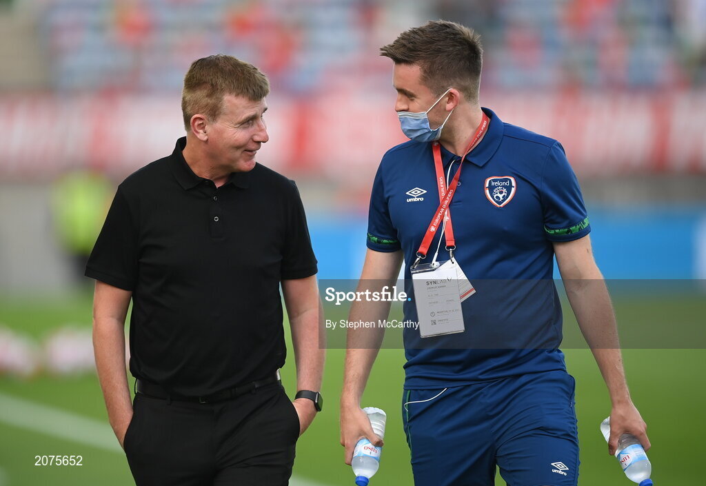 1 September 2021; Republic of Ireland manager Stephen Kenny and Kieran Crowley, FAI communications executive, before the FIFA World Cup 2022 qualifying group A match between Portugal and Republic of Ireland at Estádio Algarve in Faro, Portugal. Photo by Stephen McCarthy/Sportsfile