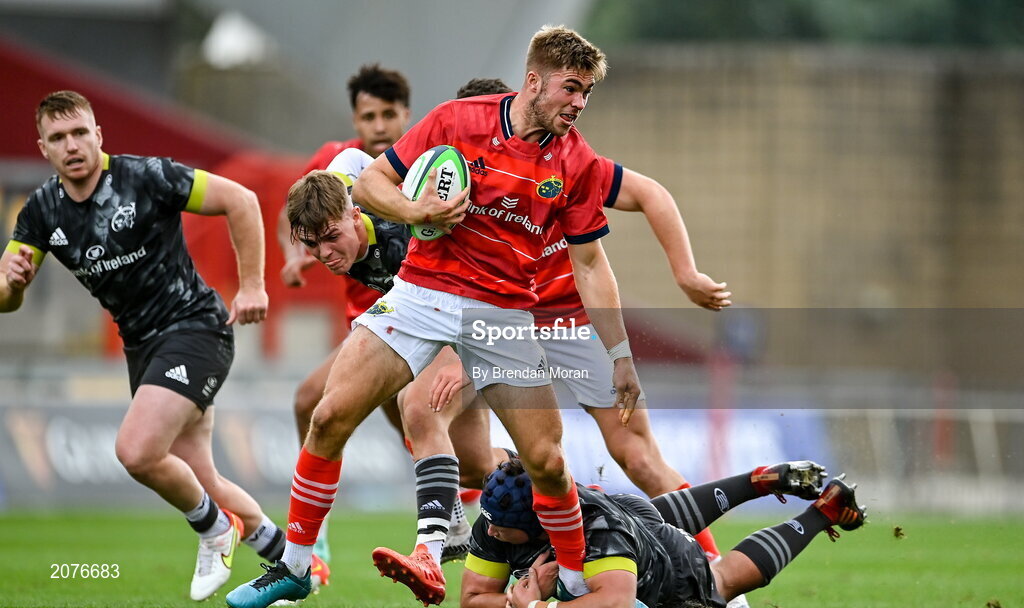 4 September 2021; Jack Crowley of Munster Red VX is tackled by Josh Wycherley of Munster Grey XV during a challenge match between Munster XV Red and Munster XV Grey at Thomond Park in Limerick. Photo by Brendan Moran/Sportsfile