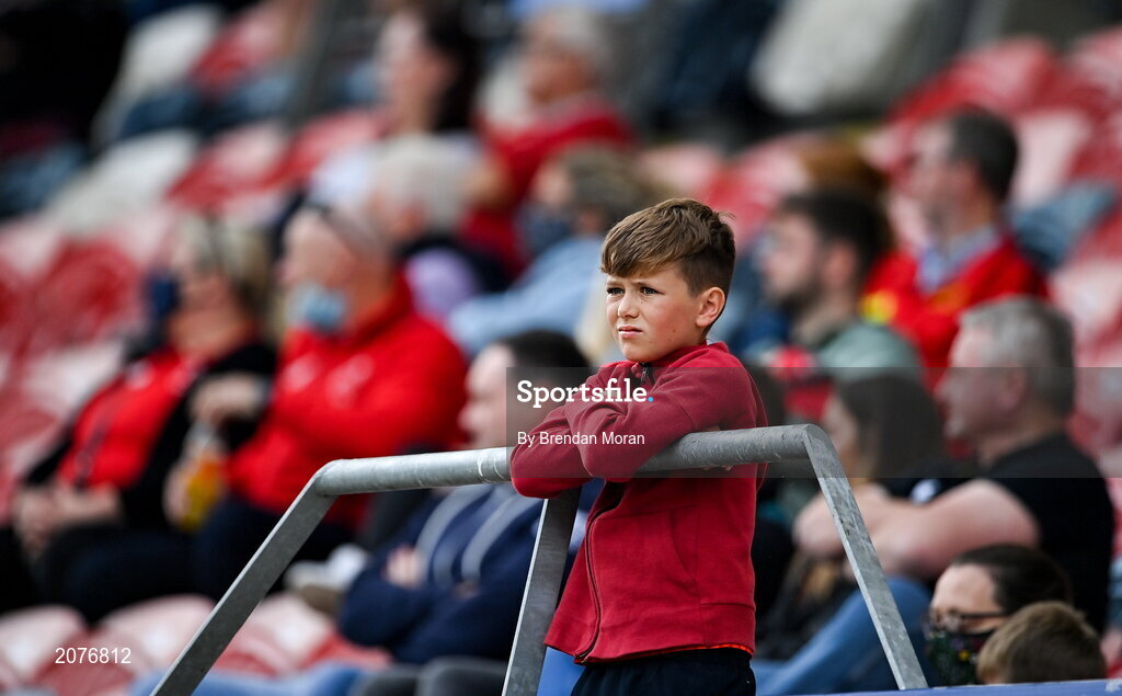 4 September 2021; A young Munster supporter looks on during a challenge match between Munster XV Red and Munster XV Grey at Thomond Park in Limerick. Photo by Brendan Moran/Sportsfile