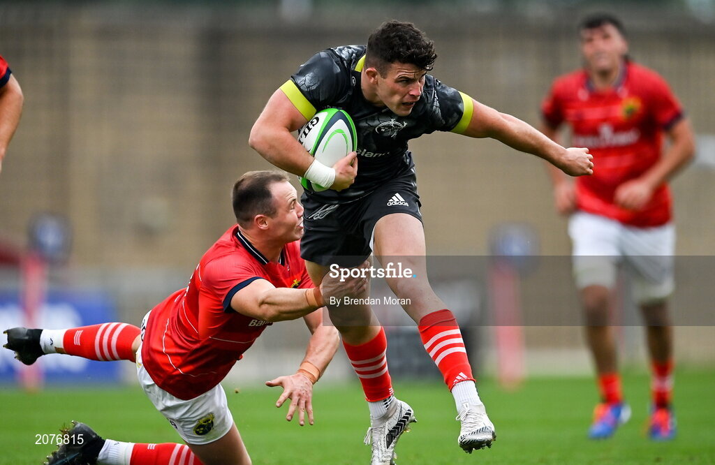 4 September 2021; Calvin Nash of Munster Grey XV escapes the tackle of Seán French of Munster Red VX during a challenge match between Munster XV Red and Munster XV Grey at Thomond Park in Limerick. Photo by Brendan Moran/Sportsfile