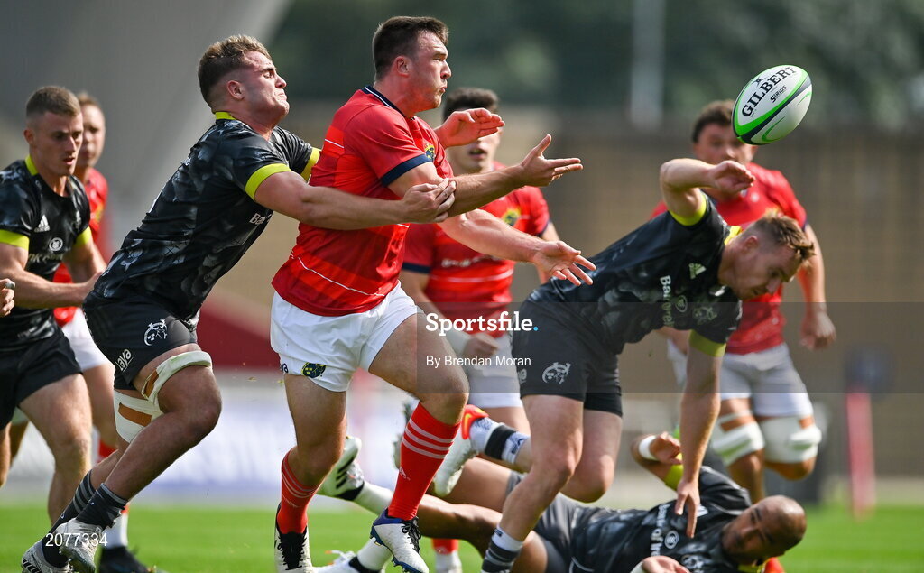 4 September 2021; Matt Gallagher of Munster Red VX is tackled by Alex Kendellen of Munster Grey XV during a challenge match between Munster XV Red and Munster XV Grey at Thomond Park in Limerick. Photo by Brendan Moran/Sportsfile