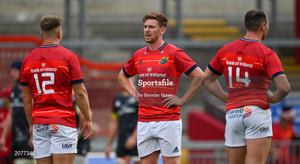 4 September 2021; Ben Healy of Munster Red XV, centre, speaks to team-mates Alex McHenry, left, and Seán French during a challenge match between Munster XV Red and Munster XV Grey at Thomond Park in Limerick. Photo by Brendan Moran/Sportsfile