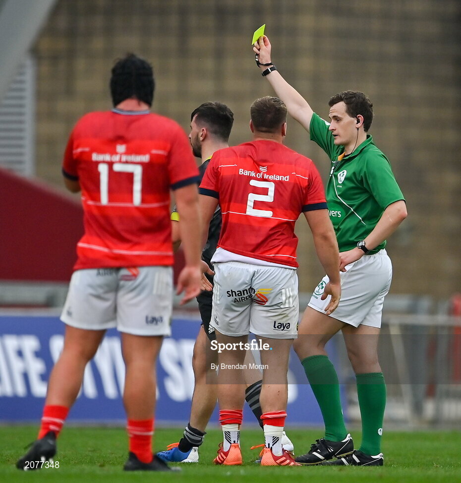 4 September 2021; Scott Buckley of Munster Red VX is shown a yellow card by the referee during a challenge match between Munster XV Red and Munster XV Grey at Thomond Park in Limerick. Photo by Brendan Moran/Sportsfile