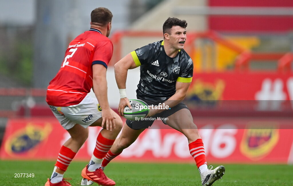 4 September 2021; Calvin Nash of Munster Grey XV in action against Scott Buckley of Munster Red VX during a challenge match between Munster XV Red and Munster XV Grey at Thomond Park in Limerick. Photo by Brendan Moran/Sportsfile