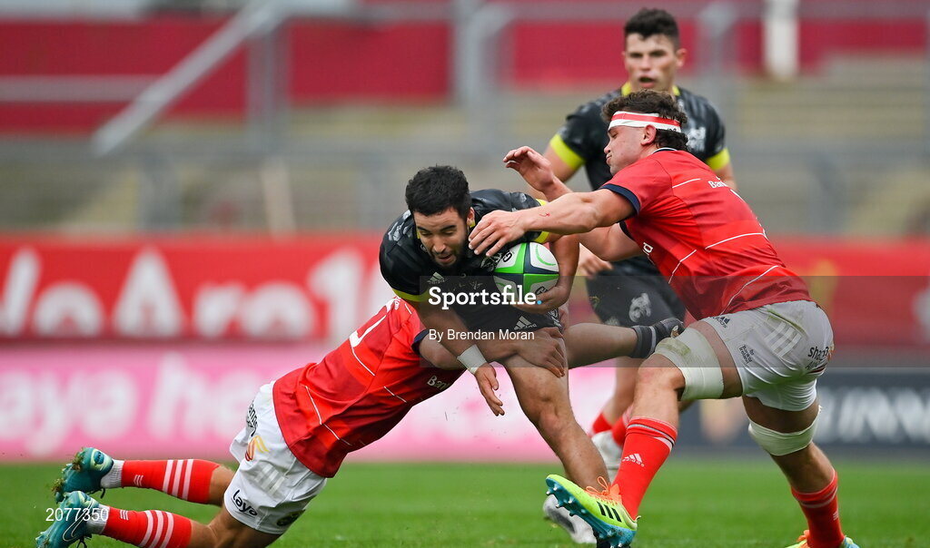 4 September 2021; Paddy Patterson of Munster Grey XV is tackled by Jack Crowley, left, and Jack Daly of Munster Red VX during a challenge match between Munster XV Red and Munster XV Grey at Thomond Park in Limerick. Photo by Brendan Moran/Sportsfile