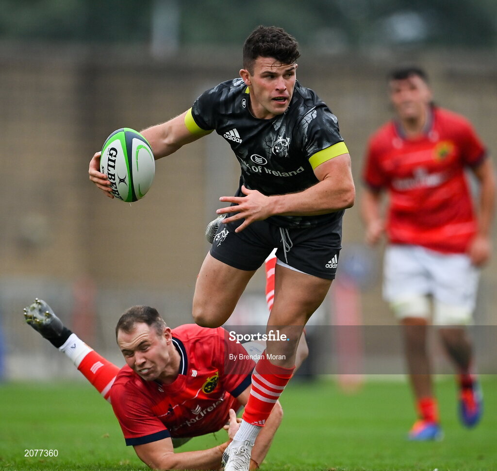 4 September 2021; Calvin Nash of Munster Grey XV is tackled by Seán French of Munster Red VX during a challenge match between Munster XV Red and Munster XV Grey at Thomond Park in Limerick. Photo by Brendan Moran/Sportsfile