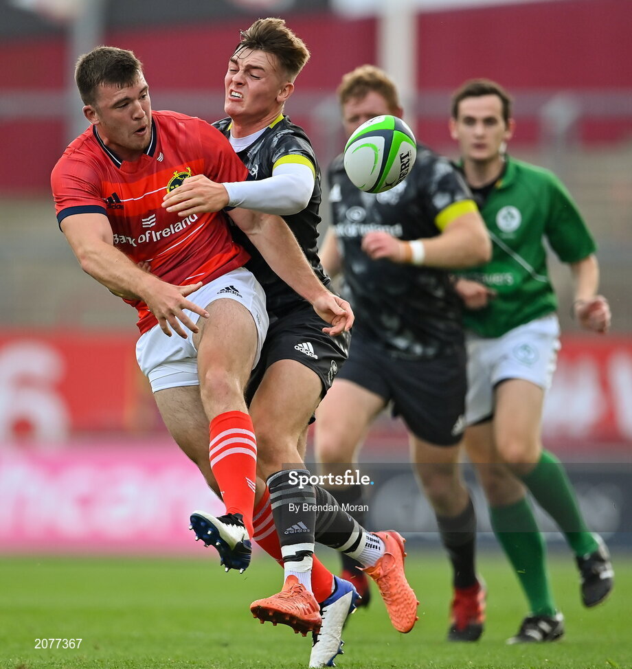 4 September 2021; Matt Gallagher of Munster Red VX is tackled by Jake Flannery of Munster Grey XV during a challenge match between Munster XV Red and Munster XV Grey at Thomond Park in Limerick. Photo by Brendan Moran/Sportsfile