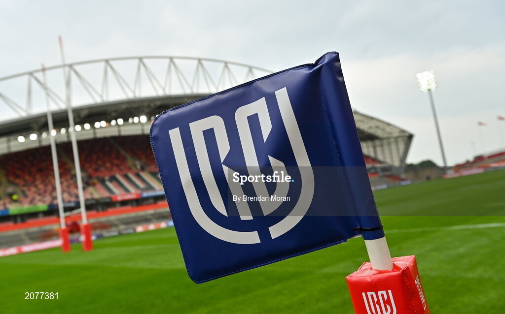 4 September 2021; A general view of United Rugby Championship branding on a flag at Thomond Park in Limerick. Photo by Brendan Moran/Sportsfile