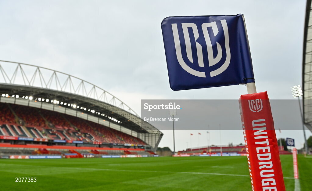 4 September 2021; A general view of United Rugby Championship branding on a flag at Thomond Park in Limerick. Photo by Brendan Moran/Sportsfile