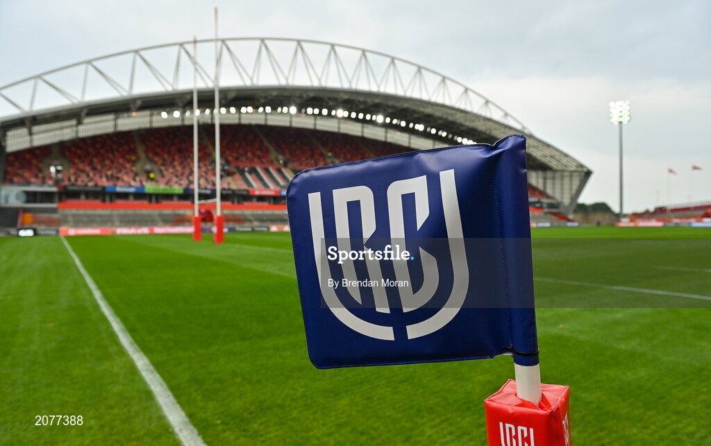 4 September 2021; A general view of United Rugby Championship branding on a flag at Thomond Park in Limerick. Photo by Brendan Moran/Sportsfile