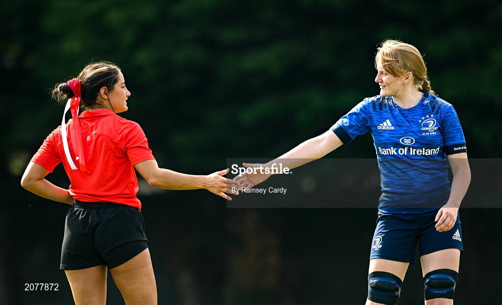 5 September 2021; Team captains Sarah Shreshta of Ulster and Aoife Wafer of Leinster before the IRFU U18 Women's Interprovincial Championship Round 2 match between Leinster and Ulster at Templeville Road in Dublin. Photo by Ramsey Cardy/Sportsfile