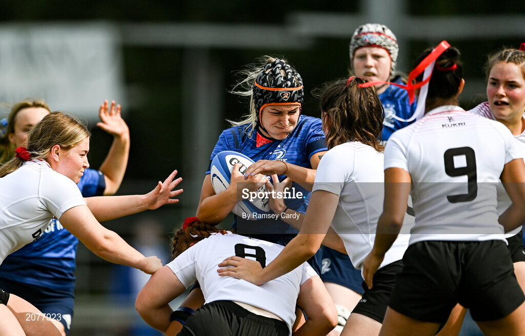 5 September 2021; Erin King of Leinster is tackled by Sophie Barrett of Ulster during the IRFU U18 Women's Interprovincial Championship Round 2 match between Leinster and Ulster at Templeville Road in Dublin. Photo by Ramsey Cardy/Sportsfile