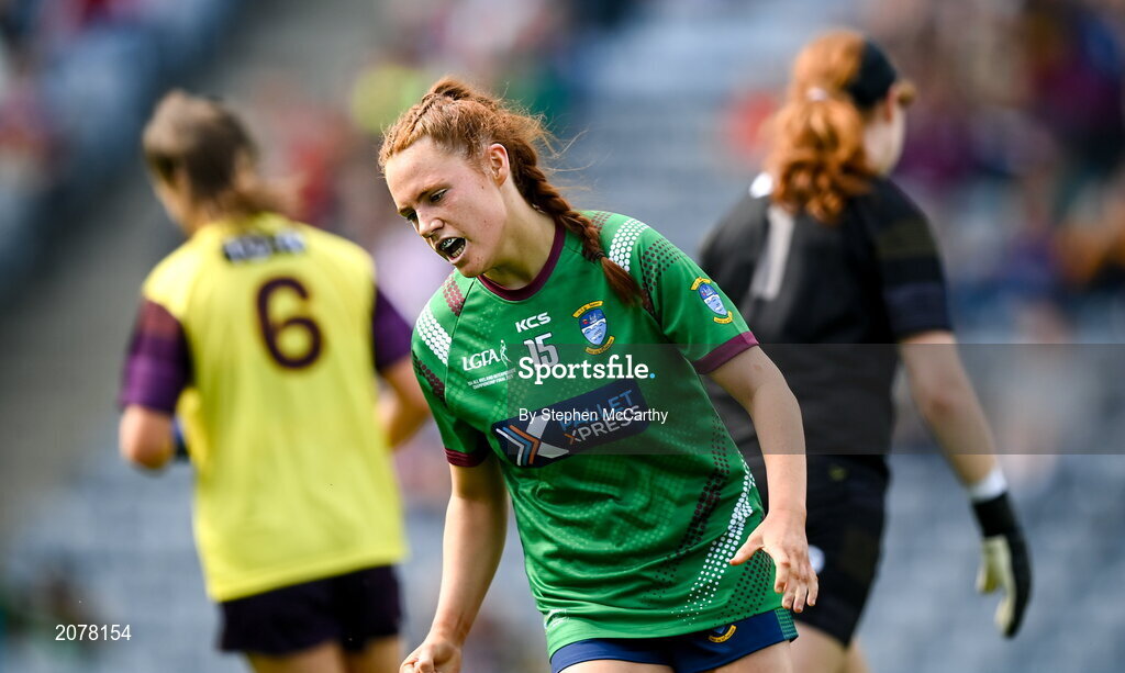 5 September 2021; Sarah Dillon of Westmeath celebrates after scoring her side's third goal during the TG4 All-Ireland Ladies Intermediate Football Championship Final match between Westmeath and Wexford at Croke Park in Dublin. Photo by Stephen McCarthy/Sportsfile