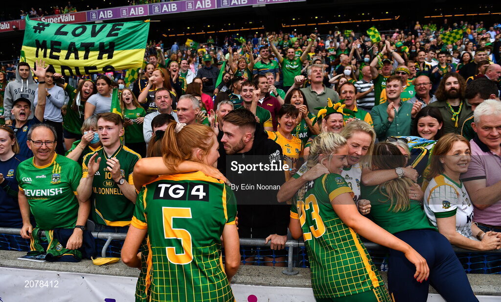 5 September 2021; Meath players celebrate with supporters after the TG4 All-Ireland Ladies Senior Football Championship Final match between Dublin and Meath at Croke Park in Dublin. Photo by Eóin Noonan/Sportsfile