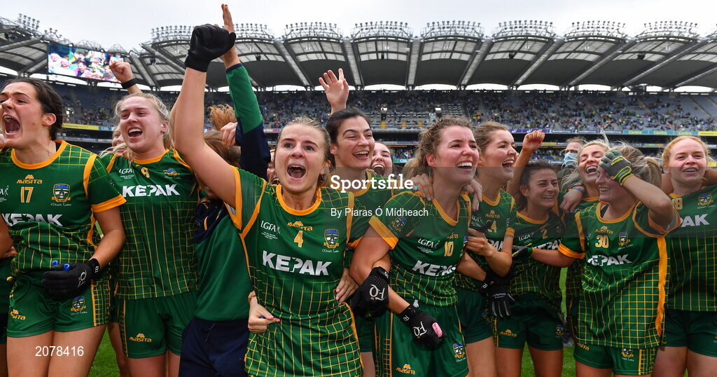 5 September 2021; Meath players, including Katie Newe, 4, celebrate after their side's victory in the TG4 All-Ireland Ladies Senior Football Championship Final match between Dublin and Meath at Croke Park in Dublin. Photo by Piaras Ó Mídheach/Sportsfile