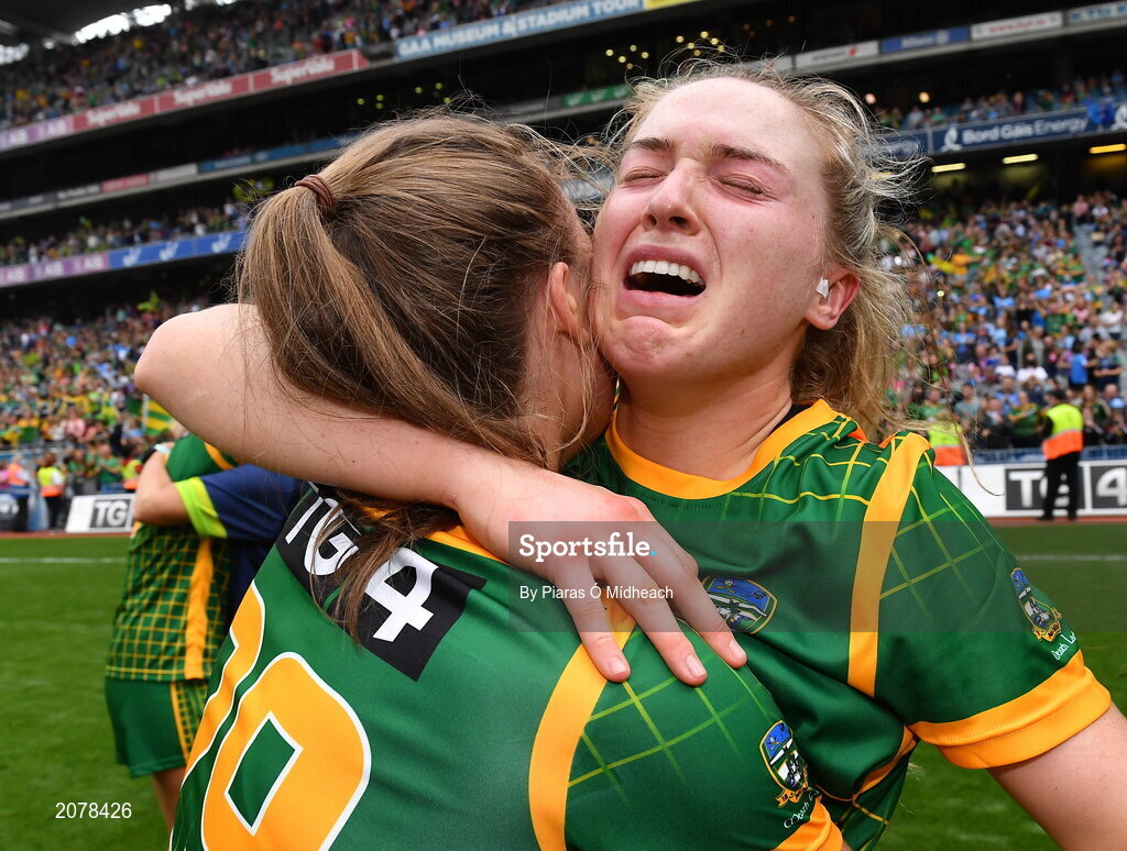 5 September 2021; Meath players Orlagh Lally, right, and Ali Sherlock celebrate after their side's victory in the TG4 All-Ireland Ladies Senior Football Championship Final match between Dublin and Meath at Croke Park in Dublin. Photo by Piaras Ó Mídheach/Sportsfile