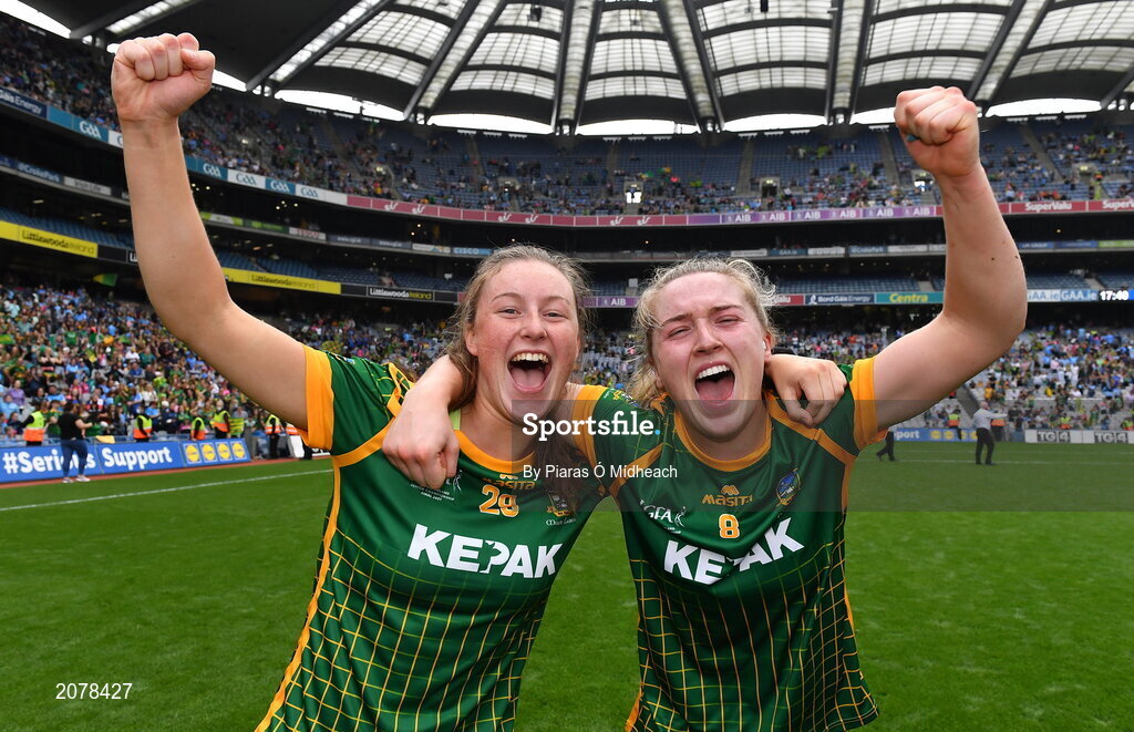 5 September 2021; Meath players Ali Sherlock, left, and Orlagh Lally celebrate after their side's victory in the TG4 All-Ireland Ladies Senior Football Championship Final match between Dublin and Meath at Croke Park in Dublin. Photo by Piaras Ó Mídheach/Sportsfile