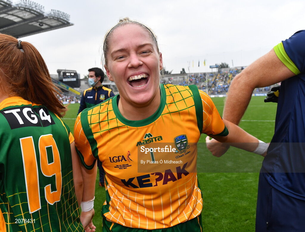 5 September 2021; Meath goalkeeper Monica McGuirk celebrates after her side's victory in the TG4 All-Ireland Ladies Senior Football Championship Final match between Dublin and Meath at Croke Park in Dublin. Photo by Piaras Ó Mídheach/Sportsfile