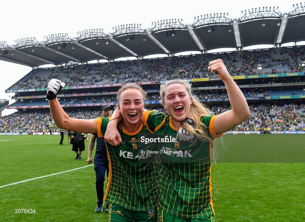 5 September 2021; Meath players Aoibhín Cleary, left, and Orlagh Lally celebrate after her side's victory in the TG4 All-Ireland Ladies Senior Football Championship Final match between Dublin and Meath at Croke Park in Dublin. Photo by Piaras Ó Mídheach/Sportsfile